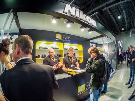KIEV, UKRAINE - OCTOBER 11, 2015: Visitors testing professional photographic cameras on Nikon booth during CEE 2015, the largest electronics trade show of Ukraine in ExpoPlaza Exhibition Center.