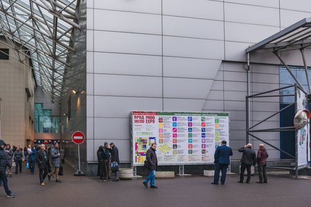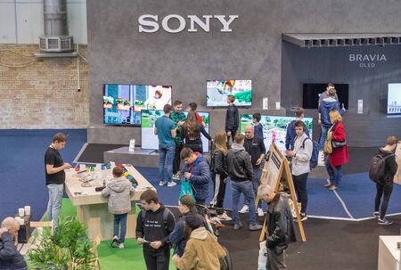 KYIV, UKRAINE - APRIL 13, 2019: Unrecognized people visit Sony Bravia, electronics manufacturer company booth during CEE 2019, the largest electronics trade show of Ukraine in Tetra Pack EC.