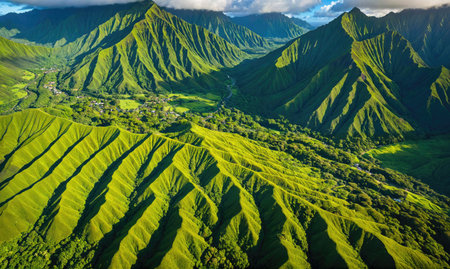 Overhead shot of a lush green valley nestled between mountain ridges with plenty of copy space in the sky