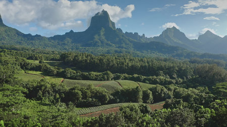 Tropical island covered by green forest hills plantation, Moorea, French Polynesia. Mountain Tohiea under blue sky in background. Remote wild nature paradise, exotic summer travel. Aerial drone flight