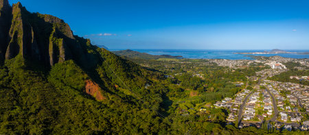 Aerial View of Oahus Mountain Range and Coastal Residential Area