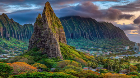 A stunning view of a sharp, spire-like mountain peak covered in green foliage, rising from a vibrant valley. The background features ridged mountains under a dramatic, cloudy sky at dusk.