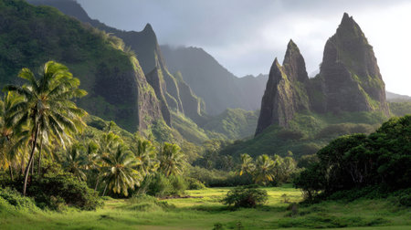 Experience the breathtaking beauty of a tropical landscape showcasing towering mountains and lush greenery under a stunning sky, perfect for exploration.