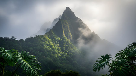 A dramatic, sharply-pointed mountain peak rises high above a lush tropical jungle, partially obscured by mist and fog, with sunlight breaking through the clouds to illuminate the rich green foliage. Large tropical leaves frame the foreground, emphasizing the exotic and rugged natural beauty.