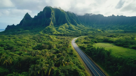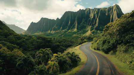 A winding road cuts through a vibrant tropical landscape, flanked by towering green mountains under a cloudy sky. The rich foliage creates a serene atmosphere.