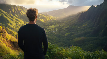 A thoughtful man gazes over a breathtaking green valley surrounded by majestic mountains at sunset, capturing the tranquil essence of nature and adventure in a serene landscape.