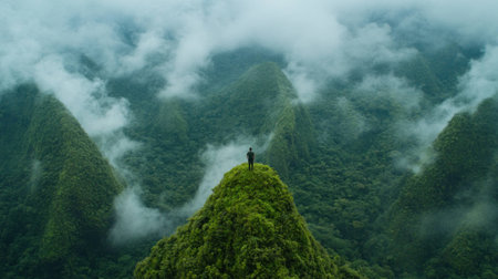 A solitary man stands atop a lush green mountain peak, surrounded by misty clouds and rolling hills, evoking feelings of serenity and exploration