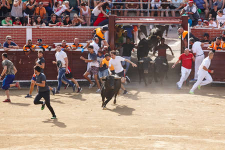 Fighting bulls running the arena. Encierros San Sebastian Reyes. Spain