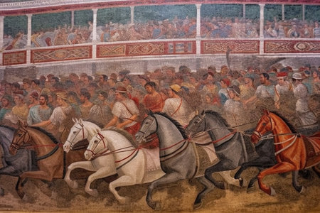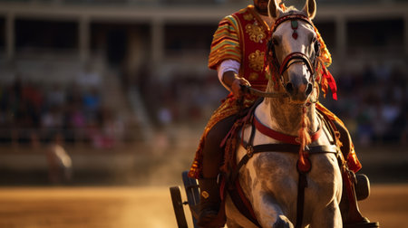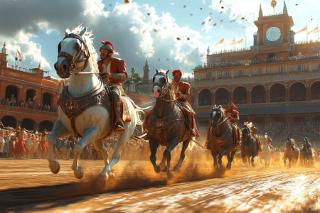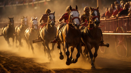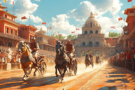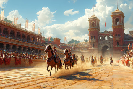 Chariot Race, Ancient City, Spectators, Sunlit Arena, Historical Event
