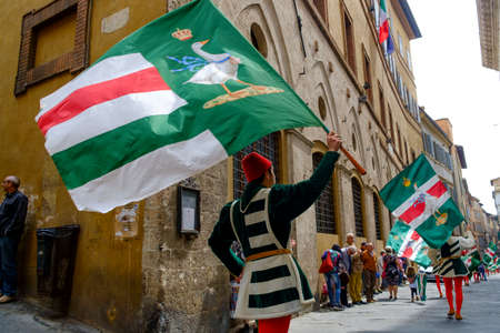 SIENA, ITALY - JULY 2013: Members of the noble Contrada dell'Oca carrying flags with a crowned goose on the Corteo Storico, a historical costume parade in Siena, Tuscany, Italy.