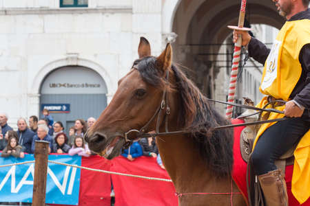 Italy, Brescia - October 01 2017: the view of the knight at the traditional tournament at celebrations of Caterina Cornaro is coming to the city, medieval festival in Brescia on October 01 2017, Lombardy, Italy.