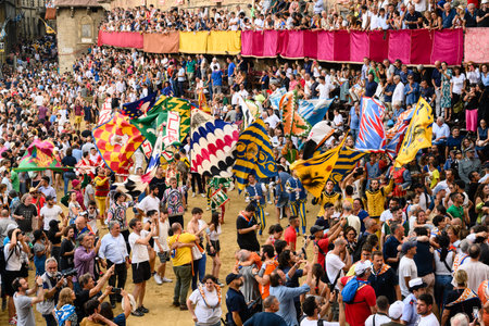 Siena, Italy - August 17 2022: Flag Waving Celebration after the Palio di Siena with Standard Bearers of the Contrada Districts on the Piazza del Campo.