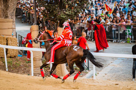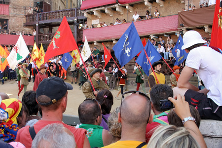 SIENA, ITALY - AUGUST 16, 2008: Palio di Siena, Tuscany, Italy. Colourful historical bareback horse race. Held in the beautiful, historical Piazza del Campo. Exciting event.