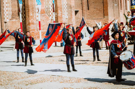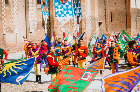 Asti, Italy - September 16, 2012:: the historic Medieval Palio of Asti in Piedmont, Italy. Flag bearers in medieval historical costume at Palio Asti. Medieval historical parade with more than 2,000 people in period costume, parading in the city before the