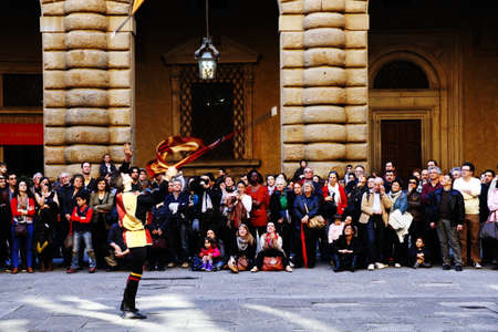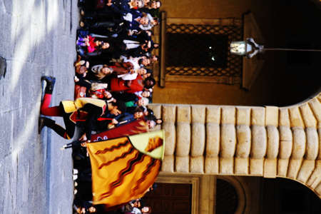 Florence, Italy - January 6, 2013: Flag throwing and waving parade as part of Epiphany day, the feast of Christian holidays and churches celebrate with a grand procession in medieval costumes.
