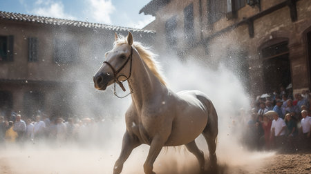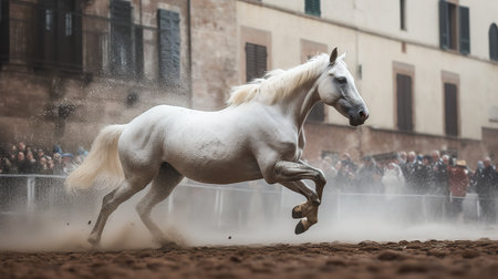 A majestic white horse is captured in motion, kicking up a cloud of snowflakes against the backdrop of the historic Palio di Siena race. The scene is imbued with a sense of magic and tranquillity, a stark contrast to the usual summer heat.