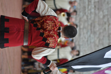 Italy, Brescia - October 01 2017: the view of the flag-bearers performance at traditional festivities of Caterina Cornaro is coming to Brescia on October 01 2017, Lombardy, Italy.