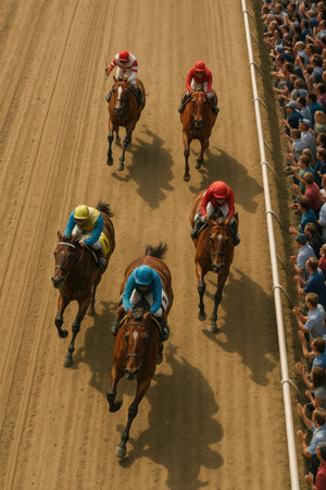 Aerial view of pack of racehorses and jockeys competing, charging forward while energized crowd lines track in eager anticipation. Kentucky Derby event, horse race, sport