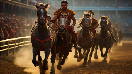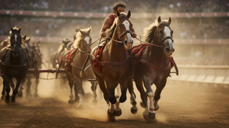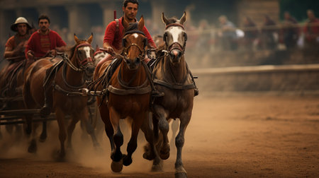 Roman chariot race with skilled drivers navigating crowded track