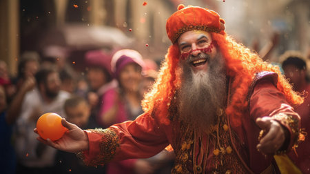 Ivrea, Italy - February 19, 2023: Battle of the Oranges scene of the town square (Piazza di Citta), with fighters and crowd, part of the historical carnival of Ivrea, Piedmont, Northern Italy