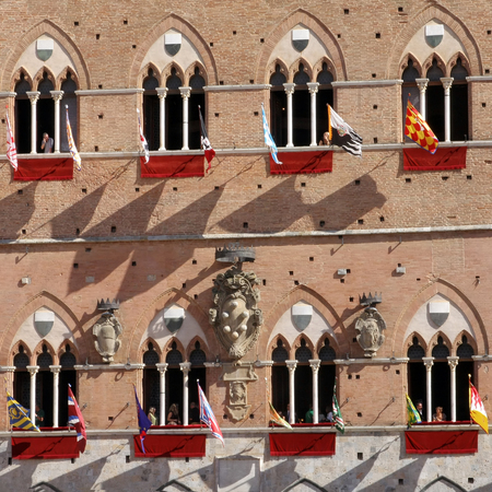 Siena, Italy. Old Town is divided into traditional districts (contrade) with distinct flags and colors. Valdimontone (Valley of the Ram).
