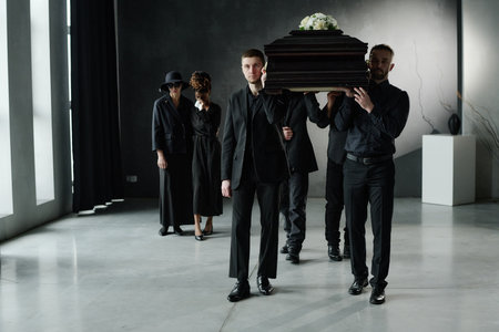 Group of men carrying coffin while Black woman and Caucasian woman in black clothing following behind during funeral ceremony in modern indoor setting