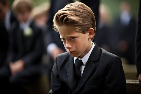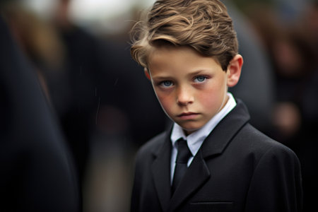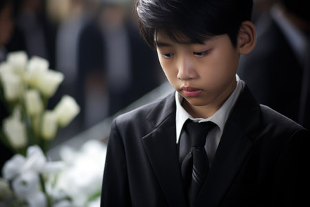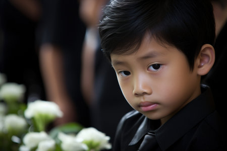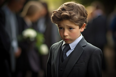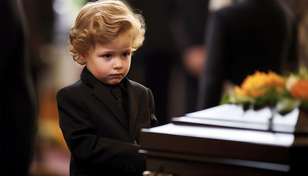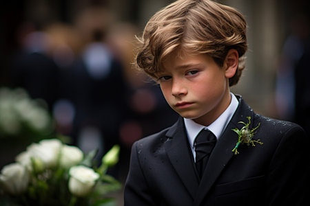 little sad boy standing in front of a coffin decorated with flowers for funeral. Child on cemetery or funeral home feeling sad and lonely crying