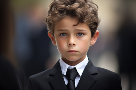 Young boy in a business suit with a jacket on his shoulders. Selective focus.