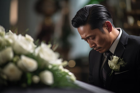 Respectful man mourning by standing solemnly amidst colorful flowers