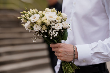 A handsome groom tenderly holds a delicate white bouquet of lisianthus and baby's breath at a wedding, symbolizing love and commitment, formal occasion