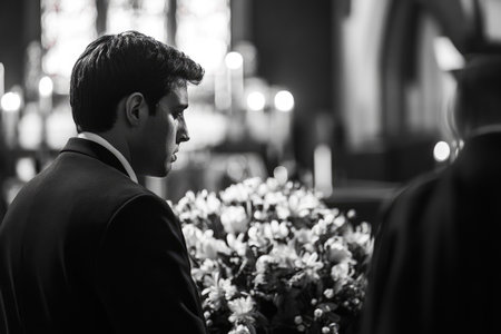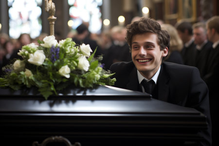 Emotional farewell at a funeral service with a beautifully arranged floral tribute on a polished wooden casket in a solemn atmosphere