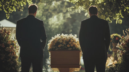 Funeral ceremony with two men in dark suits standing next to a flower-decorated light-colored wooden coffin, reflecting solemnity and respect