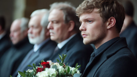 A young man stands in solemn reflection during a memorial ceremony, holding a bouquet of flowers, surrounded by a gathering of mourners in deep thought.