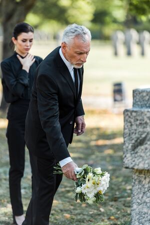Senior widow in mourning clothes adjusting white lilies on black coffin next to church