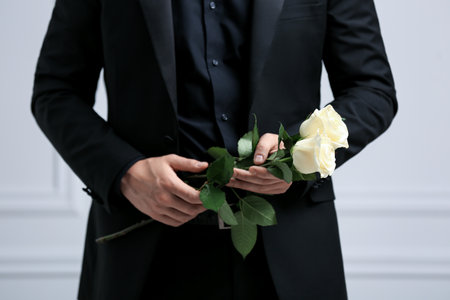 Man with rose flowers near white wall, closeup. Funeral ceremony