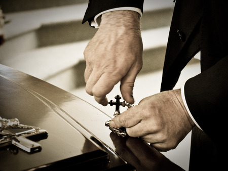 Funeral. A man stands at the coffin, saying goodbye to a loved one. Clinging to his faith, he offers a heartfelt prayer for the departed soul.