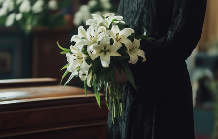 A person in black holds a bouquet of white lilies during a solemn funeral service