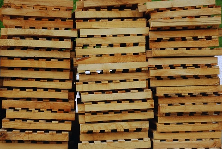 A pile of wooden pallets stacked on top of each other, ready for storage or transportation.
