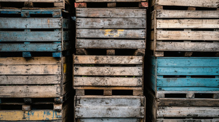 A close-up view of stacked rustic wooden crates in a variety of earthy colors, highlighting their weathered textures and unique patterns for creative design use.