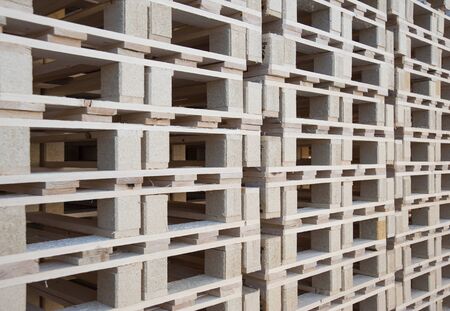 Stacks of wooden pallets in warehouse outdoor storage for industrial transportation.