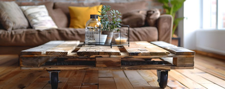 Furniture from a pallet. Pallet furniture with wheels. Modern interior detail