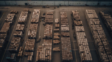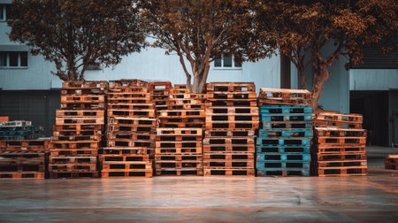 Stacked wooden pallets at a storage yard, highlighting the textures and patterns of wood and the utility of these essential components in logistics and warehousing.