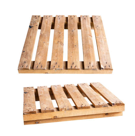 Weathered wooden pallet on white backdrop symbolizes transportation and storage in logistics, with copy space for text