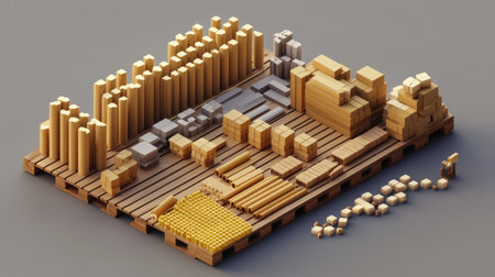 This image features an organized array of wooden blocks and planks laid out on a pallet, ideal for construction and creative projects.