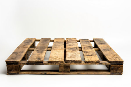 A wooden pallet rests against a white background, showcasing a clean and minimalist design. Ideal for projects requiring a rustic yet modern aesthetic.