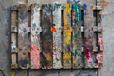 Close up stack of many vivid multicolor painted colorful wooden pallets, high angle diagonal view