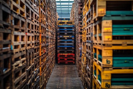 A stack of wooden pallets in an industrial warehouse, ready for transport and storage