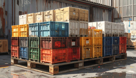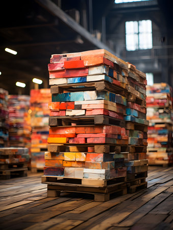 Colorful wooden pallets stacked in an industrial warehouse, illustrating themes related to storage, logistics, and manufacturing.