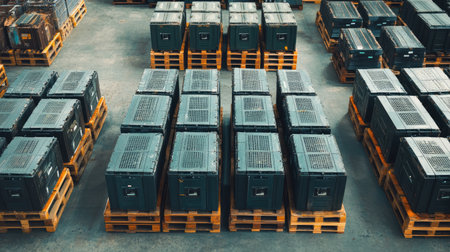 An overhead shot showcasing neatly arranged industrial containers on wooden pallets in a warehouse, highlighting efficient storage solutions for logistics and supply chain operations.