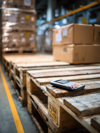 Barcode scanner rests on wooden pallets surrounded by stacked boxes in a warehouse, highlighting organization and inventory tracking process.